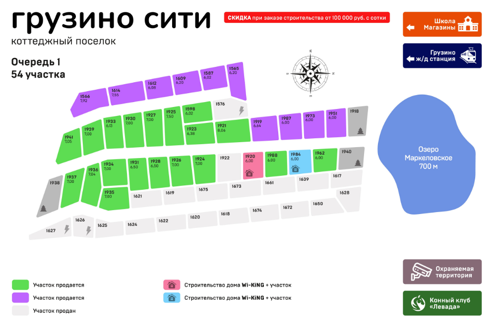 Акция! При заказе строительства дома Wi-KiNG действует скидка от 100 000 ₽ с сотки (не распространяется на участки № 1620, 1622, 1624).